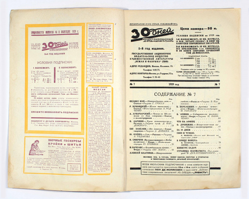 Soviet magazine Thirty Days, issue number 7, 1929. An illustrated Constructivist monthly magazine on current affairs in the Soviet Union. A Constructivist front cover in orange and brown designed by B. Titov. In this edition are articles entitled ‘Fifteen Years’, ‘Polished Plan’ and an extended feature on Chekov. It also features a piece ‘Lesson for a Writer’ and an illustrated story ‘Dream’. List of artwork inside: a drawing by G Gross entitled ‘And Calmness Fell’; photographs by A Rodchenko to accompany the article ‘Polished Plan’; illustrations by D Kardovsky for the article ‘Lesson for a Writer’; illustrations by A Radakov for the story ‘Dream’; photographs by Y Eremin to accompany the article ‘Waters of the Volga’. Very good condition.80 pages.