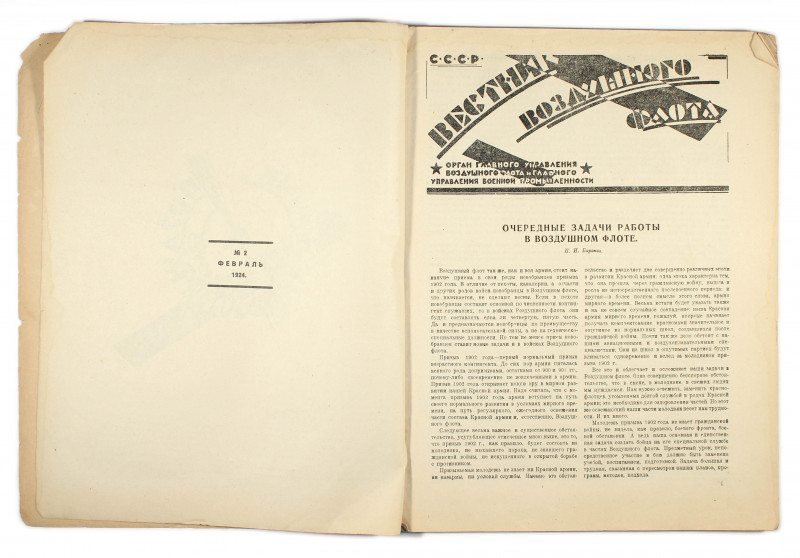 Second issue of Air Fleet's Newsletter, a magazine dedicated to the Soviet Air Fleet. Magazine has vast variety of aviation related articles focusing on its modernisation, news and technical disciplines. This issue contains pictures of aircrafts, various charts and a catalogue on aviation and aeronautics in Library of N.A. Runin. Among contributing writers were P.Dubensky, A. Kukin, K.Akashev, N. Lebedev, N. Fadeev and others. Editor of the magazine is A. Lapchinsky, Russian and Soviet military scientist, teacher, brigade commander. Theorist of military aviation, one of the founders of the operational art of air combat. Published by Main board of the Air Fleet and military industry management, 4 000 copies. Fair condition, staining, rubbings, tears and losses of material on the margins and on the spine. Covers are partially detached. Bent page corners. Pencil handwriting on the back cover. 70 pages.